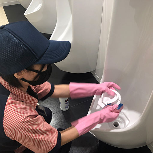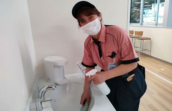 社員さんの目につくところで作業を行いますので、「笑顔で清掃」を心がけています。