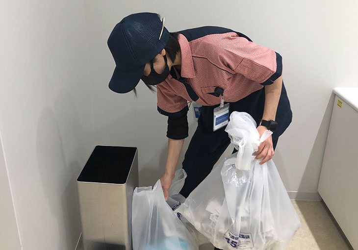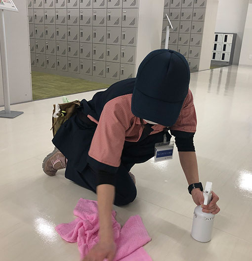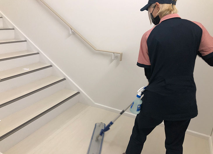 入口、ドア、通路、階段、トイレ、会議室、食堂、その他箇所、丁寧に隅々までテキパキと清掃しているのを目にします。